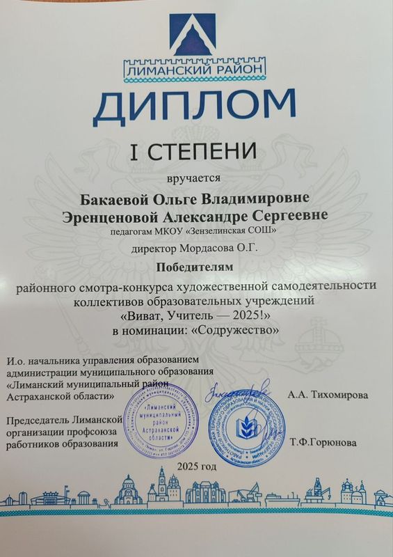 Педагоги «Точки роста»: Бакаева Ольга Владимировна и Эренценова Александра Сергеевна, стали победителями районного смотра-конкурса художественной самодеятельности коллективов образовательных учреждений «Виват, учитель-2025!» в номинации «Содружество».